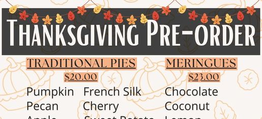 Order those last minute desserts and side NOW! You can order online under "Thanksgiving preorder" tab or by calling 281-941-9072. Payment due at time of order.