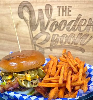Our tasty cheeseburger, pepper jack, jalapeños,spicy mayo, lettuce, tomato, pickle, onion and bacon served on a brioche bun