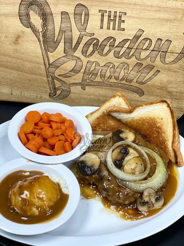 10 oz hamburger steak patty smothered in mushrooms, onions and brown gravy.
