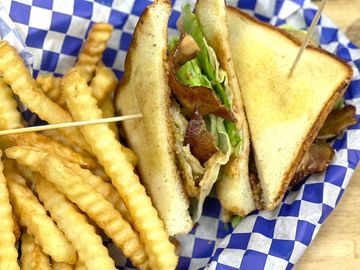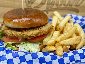Hand battered chicken fried steak, lettuce, tomato, mayo served on a brioche bun