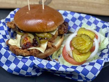 Hand battered chicken fried chicken, drizzled with Chipotle Raspberry Sauce, topped with candied jalapenos and pepperjack cheese served on a brioche bun. LTPO served on the side